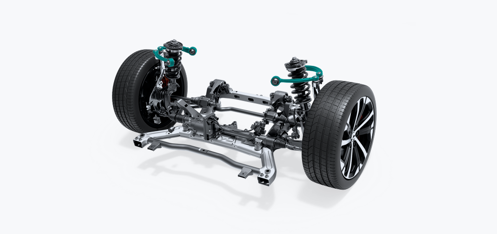 Frontfjæringen med virtuell kingpin-akse gir en kompakt utforming samtidig som den gir god demping ved brå akselerasjon og nedbremsning.